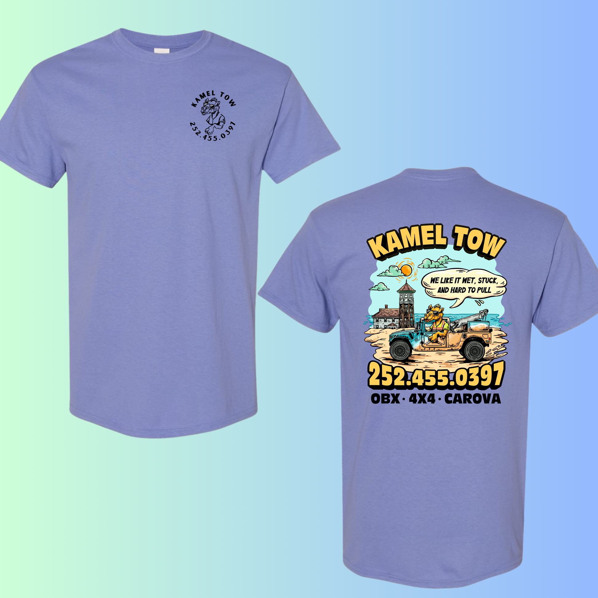 Kamel Tow Shirts have a small design on the front and a large design on the back.